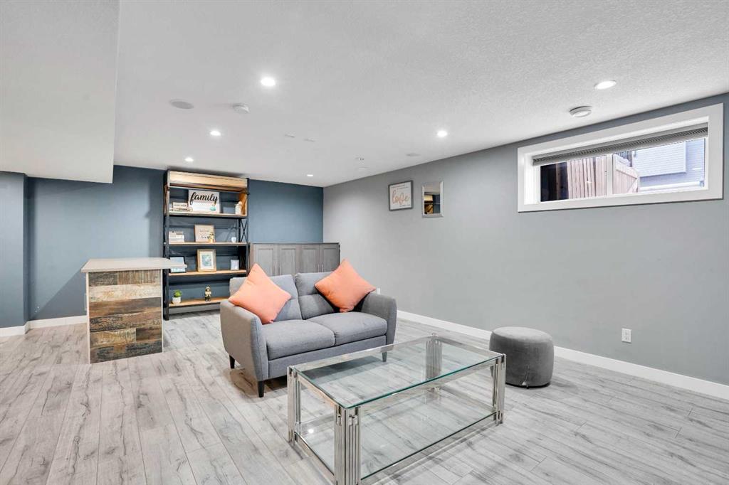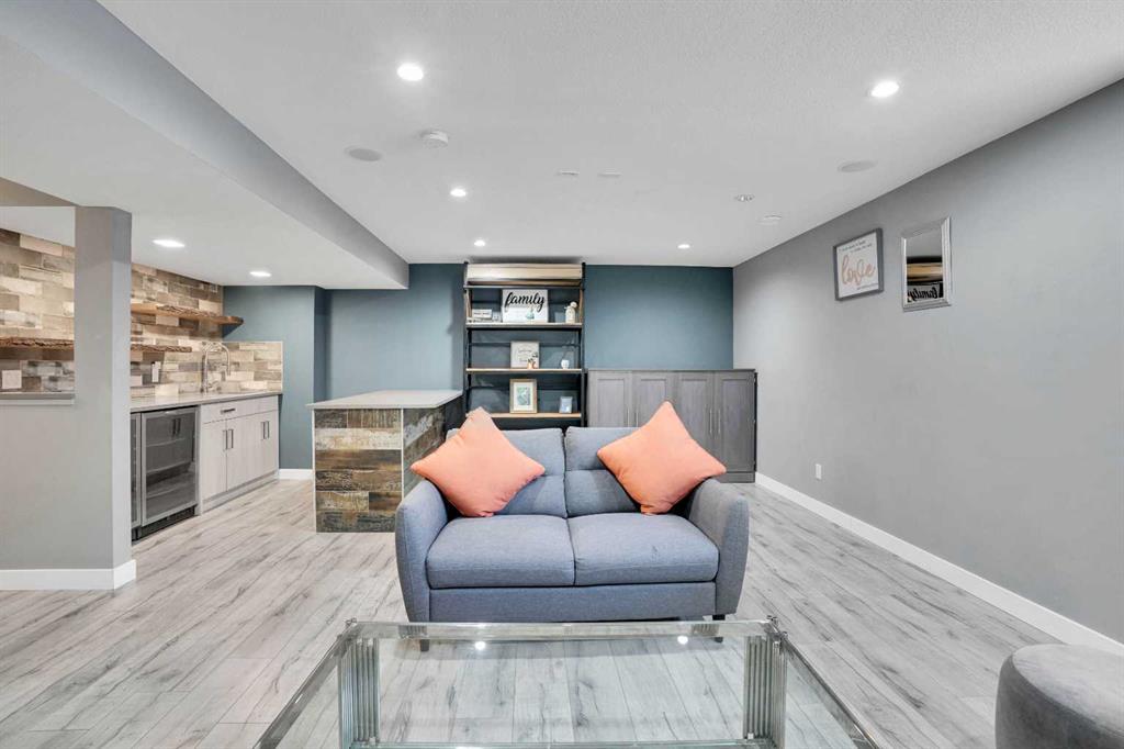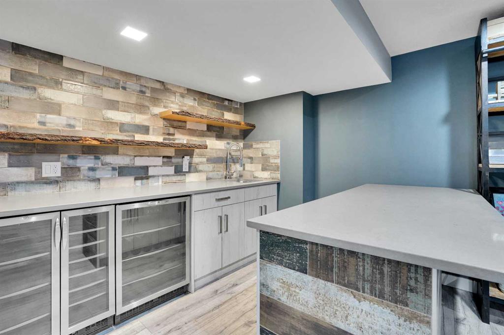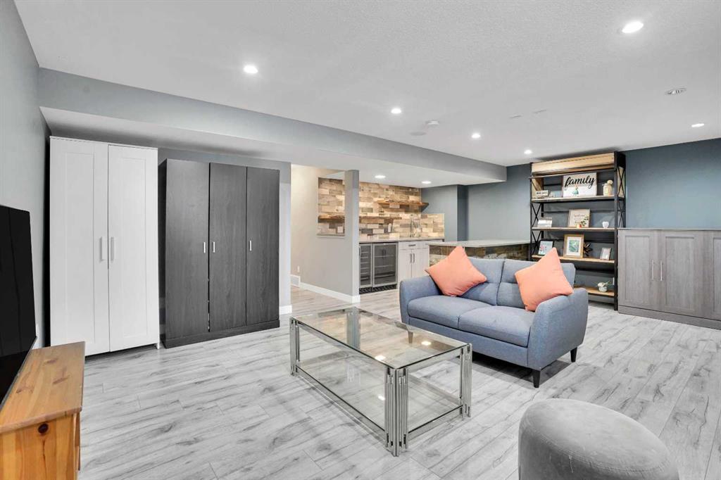FINISHED BASEMENT—a beautifully designed space loaded with upgrades! Enjoy a gorgeous wet bar with two beverage coolers, raised eating bar, ample cabinetry, and live-edge shelving. The basement also includes a generous living area with built-in SPEAKERS, a stunning 3-piece bathroom with an oversized tiled walk-in shower, HEATED FLOOR, and excellent storage options.