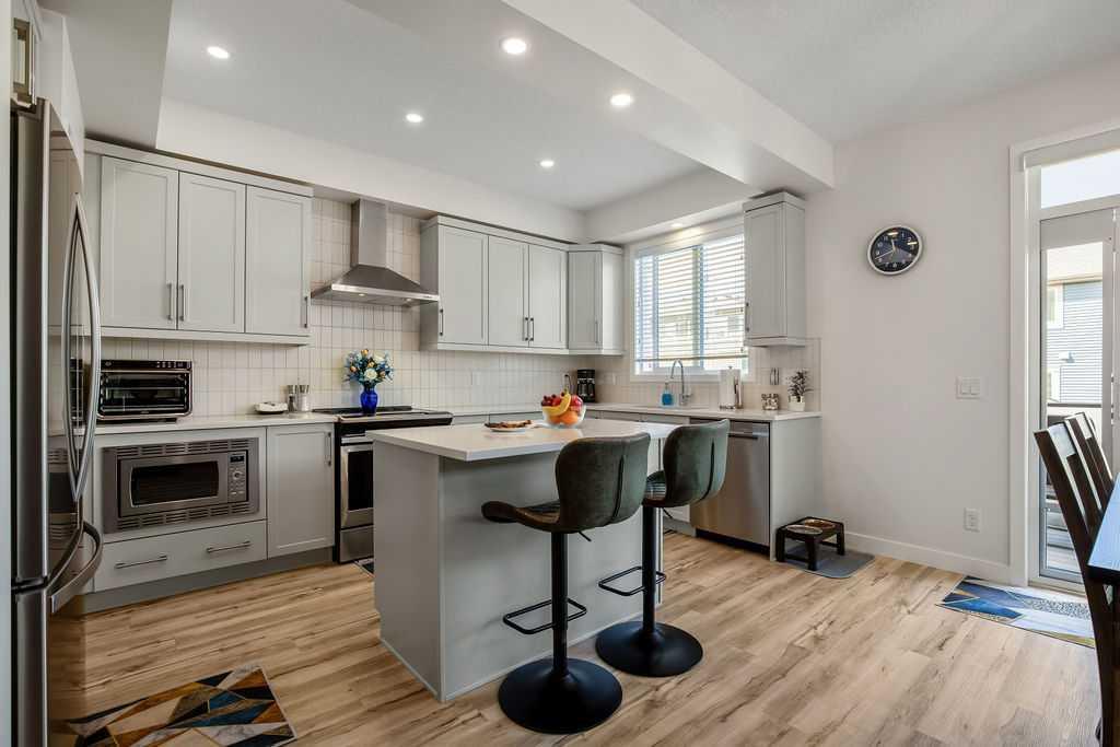 Step inside to a bright, open-concept main floor featuring durable luxury vinyl plank flooring and a spacious living area that seamlessly connects to the dining space and contemporary kitchen—perfect for both everyday living and entertaining. The kitchen is a standout with quartz countertops, a central island with flush eating bar, upgraded lighting, and a full stainless steel appliance package including a French door fridge with icemaker, glass-top stove, built-in dishwasher, designer hood fan, and built-in microwave.