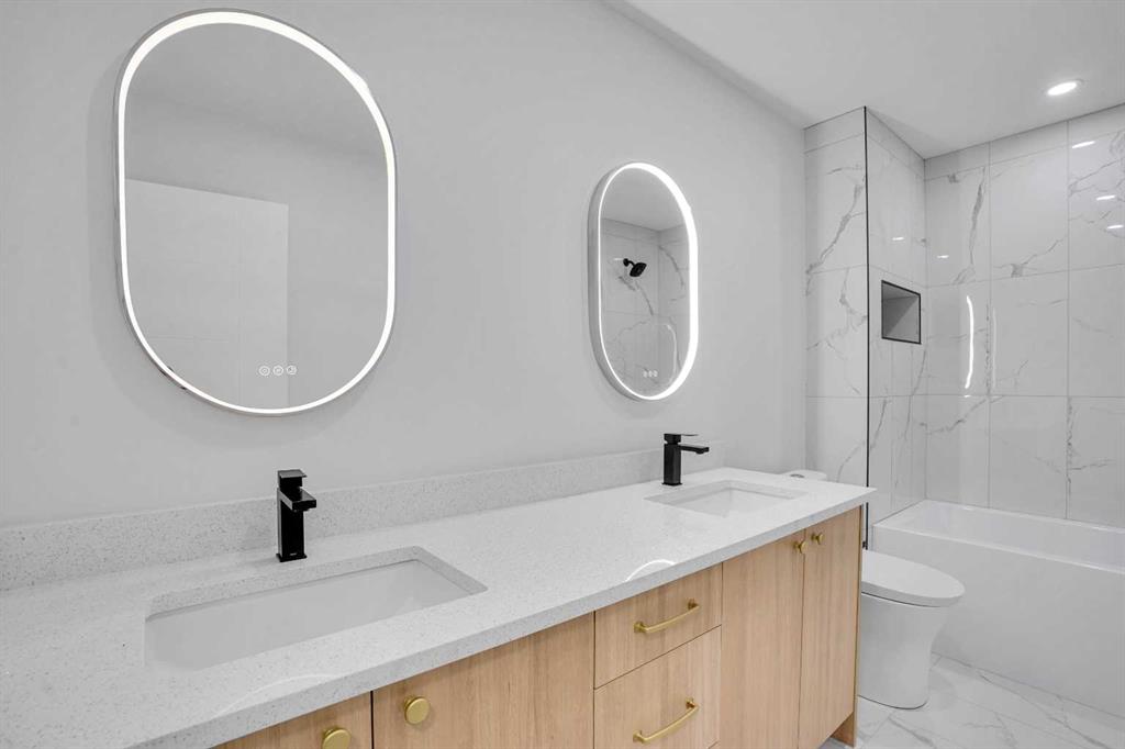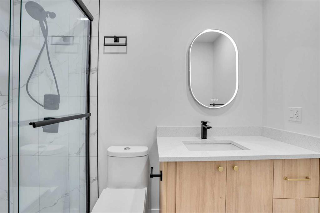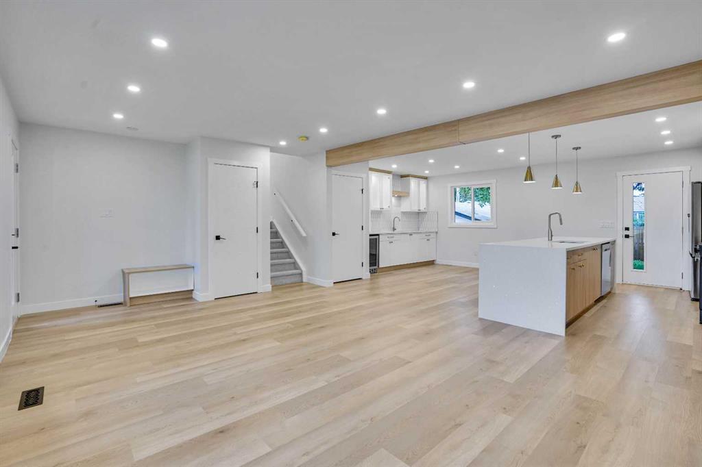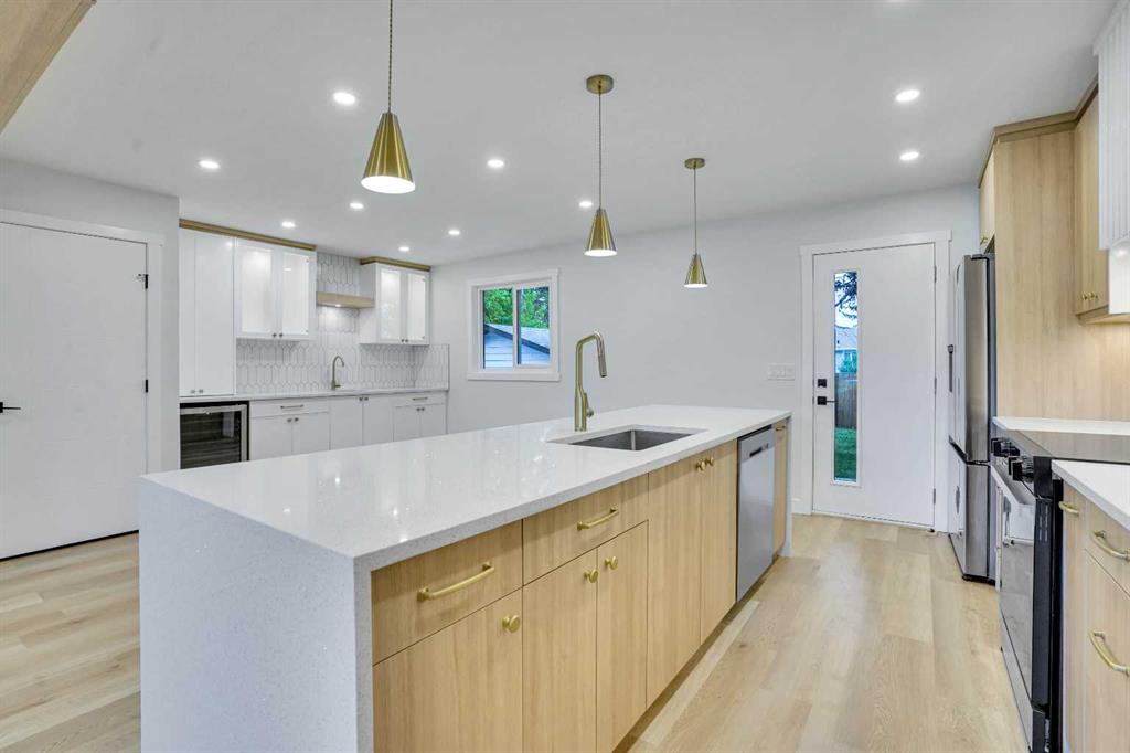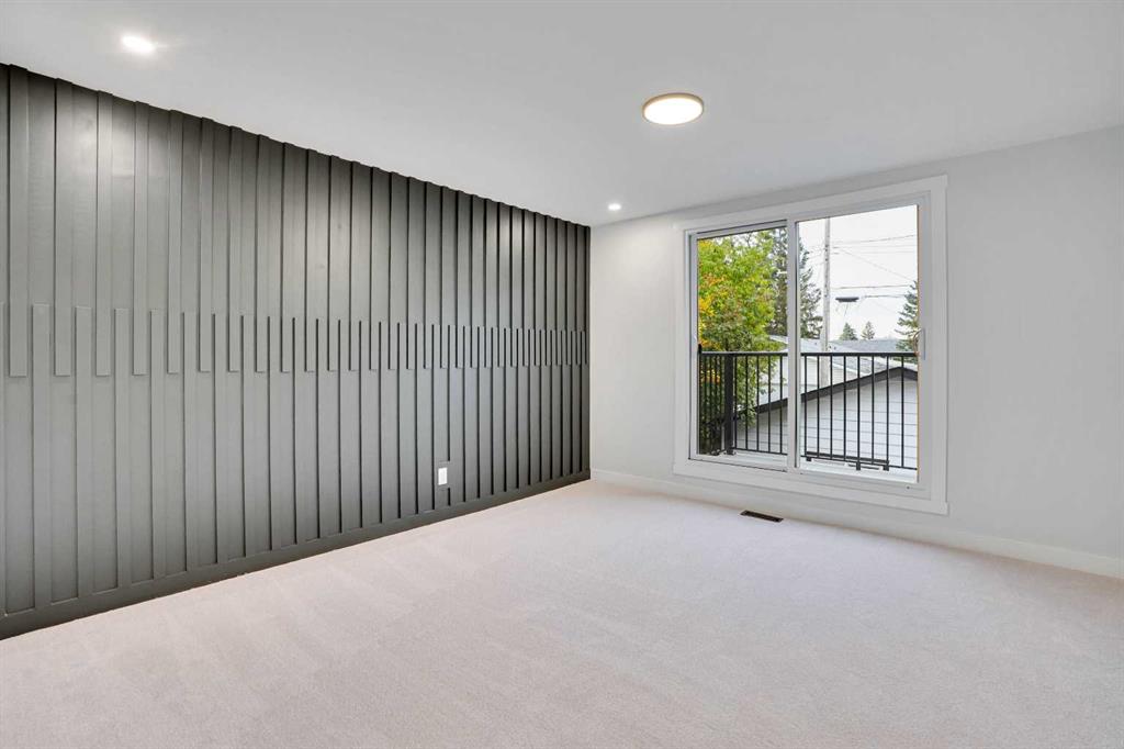 The main floor features an open concept layout with a chef-inspired kitchen complete with a striking waterfall island, brand new appliances, and custom cabinetry. The dining and living areas are bright and inviting, anchored by a sleek electric fireplace, while a custom bar on the main level makes this space perfect for entertaining. Each of the three bathrooms has been completely redesigned with high-end finishes including the spa-like ensuite that provides a private retreat for the homeowner.