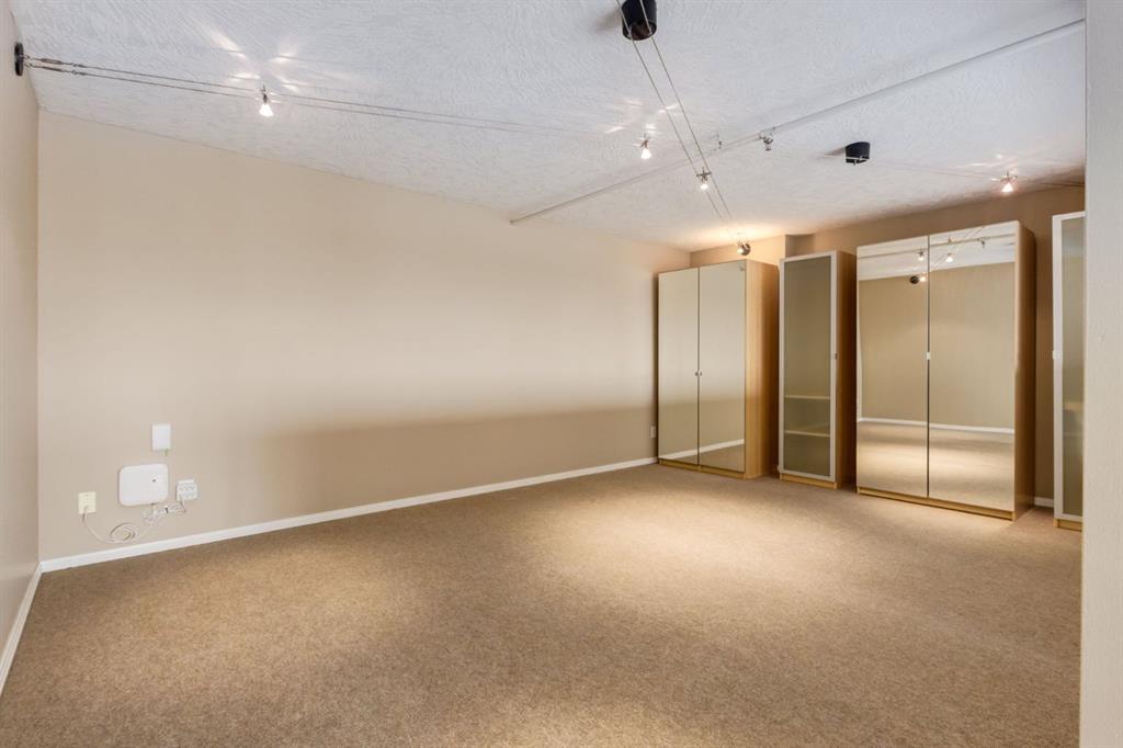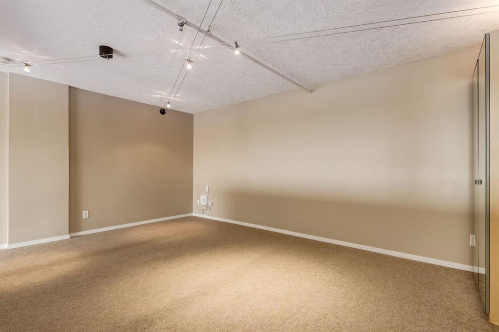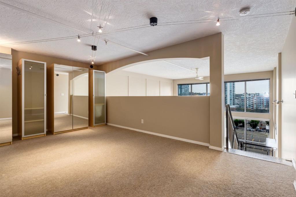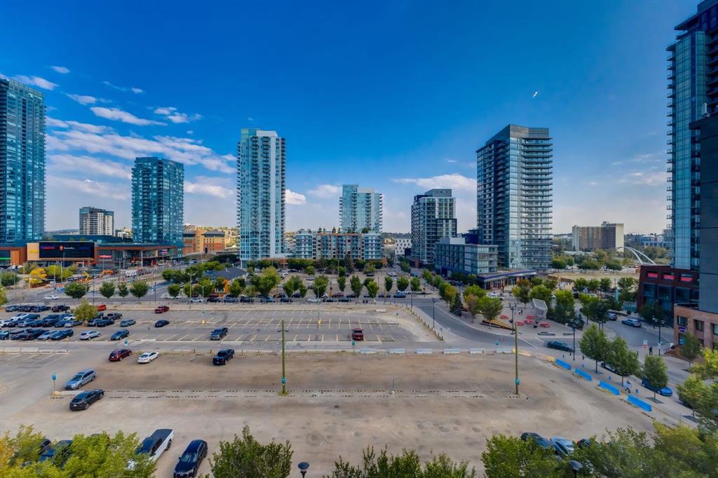 The north-facing windows fill the space with soft, ambient natural light all day—perfect for working from home or relaxing—without the heat of direct sun. You'll enjoy panoramic views of East Village, the Bow River, and Calgary’s skyline.