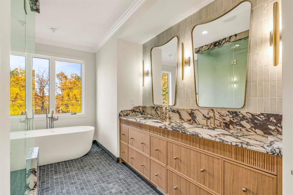 Upstairs, the PRIMARY suite exudes sophistication, featuring a matching double-sided Urbana fireplace, custom walk-in closets, and a spa-inspired ensuite with Calacatta Viola marble, a steam shower, his-and-hers sinks, soaker tub, and heated bench & floor. Two additional bedrooms each offer private ensuites and walk-in closets.