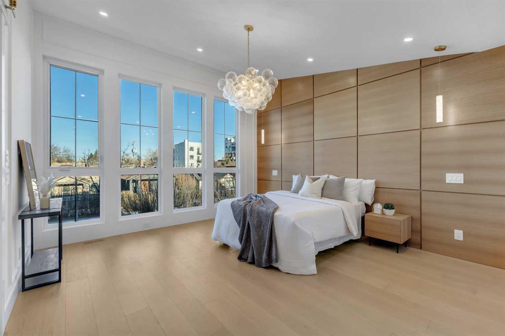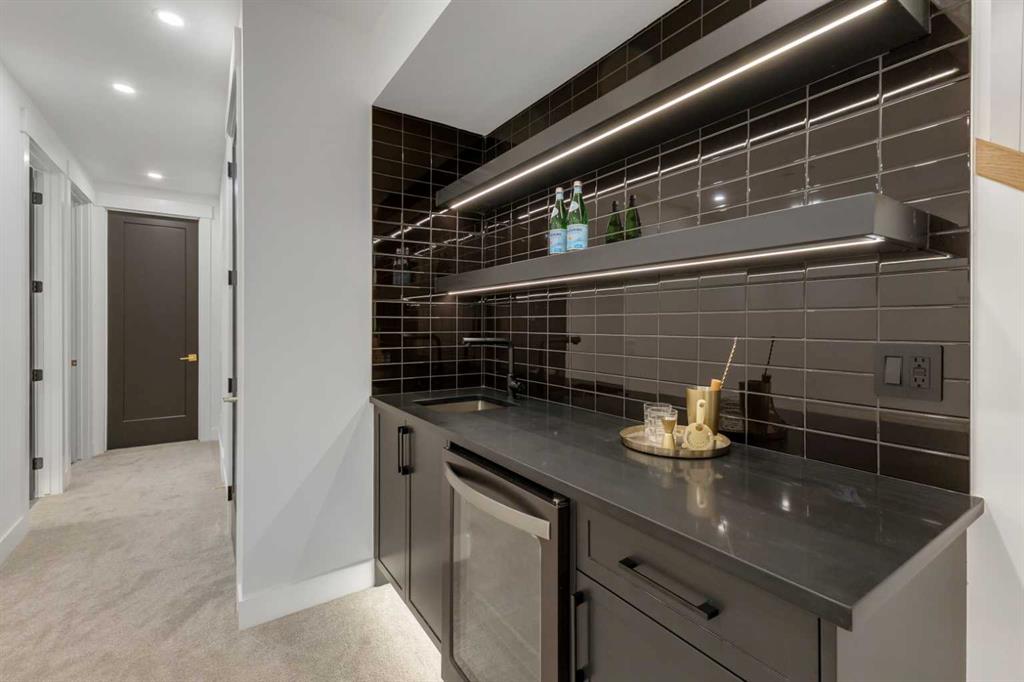 Upstairs, the primary suite is a true retreat. Vaulted ceilings create a sense of scale, while a full floor to ceiling oak panel feature wall adds depth, warmth, and architectural impact. The walk in closet is finished with custom built ins topped with quartz surfaces, combining durability with a refined aesthetic. The ensuite is equally impressive, featuring dual sinks, a freestanding soaker tub, and a fully tiled walk in steam shower, creating a calm and spa inspired space. A built in coffee bar with sink, floating shelves, and space for a beverage fridge adds everyday convenience and a boutique hotel feel.