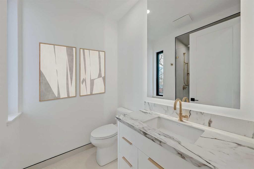 The fully developed basement features radiant in-floor heating, soaring 10-FT ceilings, and an expansive recreation area with a built-in media centre. A custom wet bar with sink & microwave drawer, dedicated home gym, fourth bedroom, three-piece bathroom, and a discreet pocket office with built-in workstation complete the level. Outside, the home is professionally landscaped and complemented by a fully finished garage with gas rough-in for a future heater. This is an exceptional opportunity to own a thoughtfully designed architectural home in one of Calgary’s most sought-after inner-city communities.