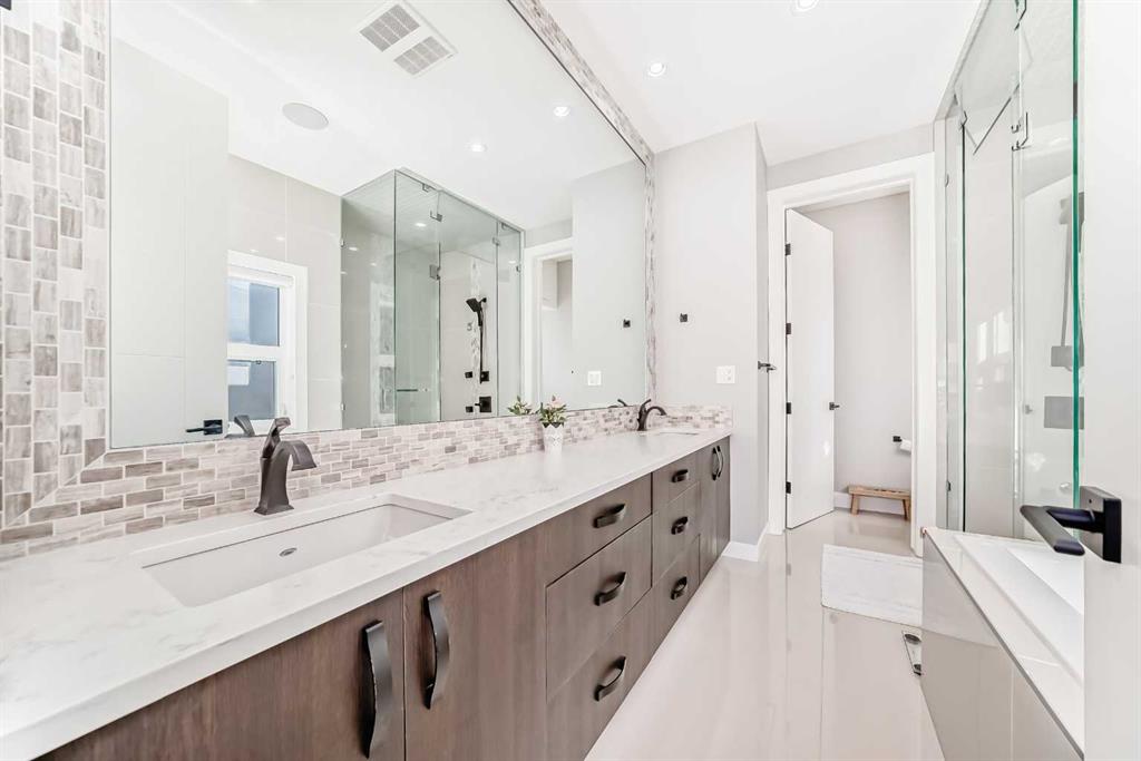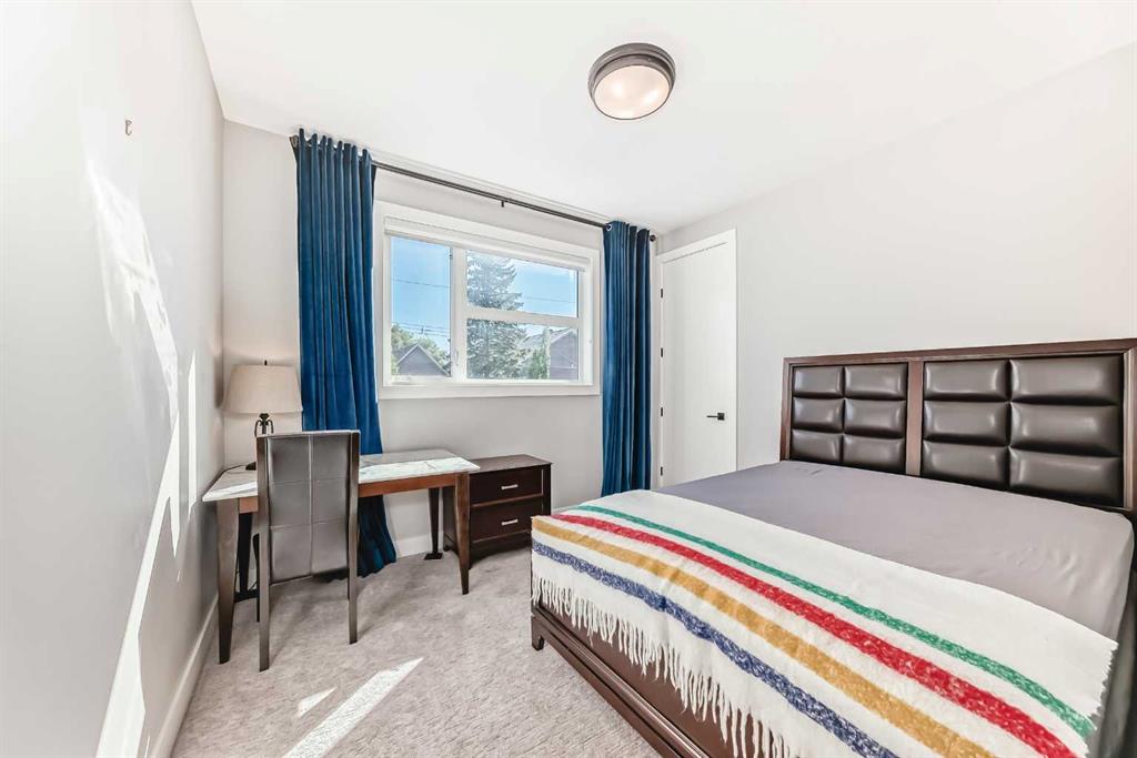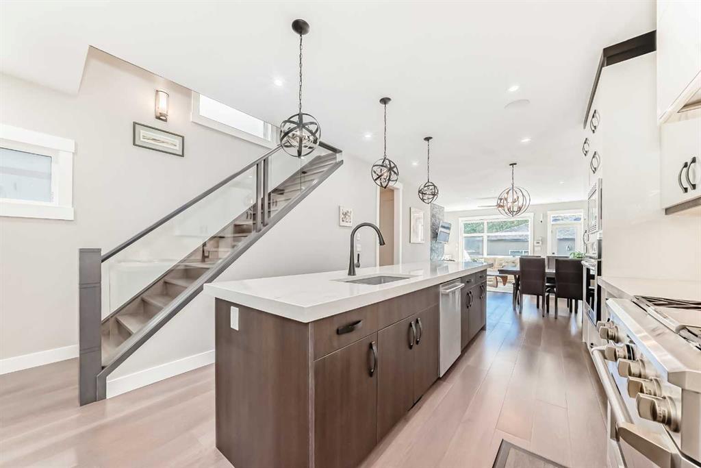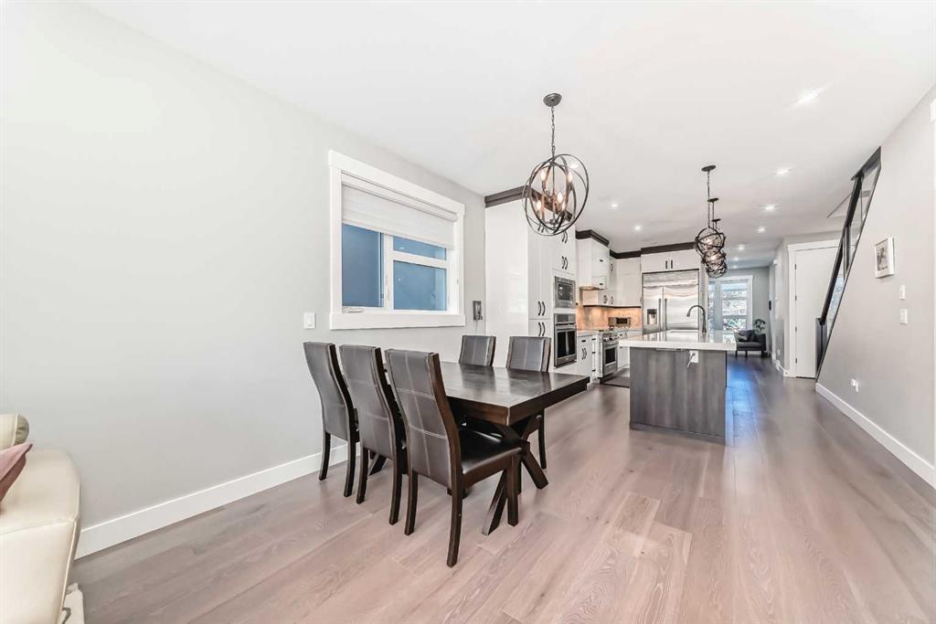 Located in Calgary’s desirable Killarney community, this well-maintained home offers a fantastic open-concept floor plan with stylish design details throughout. The main level features soaring ceilings and wide-plank hardwood floors. At the front, a versatile flex room can serve as a home office, den, or dining room. The chef’s kitchen is complete with sleek cabinetry accented by warm wood tones, herringbone tile backsplash, high-end appliances, and a large central island. The adjacent living room showcases a modern fireplace flanked by floating shelves and large windows with backyard views. A convenient side entrance provides access to the yard and double detached garage. Upstairs, three spacious bedrooms and two full bathrooms include a stunning primary suite with wall paneling, built-ins, vaulted ceiling, walk-in closet, and a luxurious ensuite with a glass shower, soaker tub, dual vanities, and a custom walk-in closet. The upper level offers both comfort and privacy for family or guests. The fully finished basement includes a family room with media cabinets and a wet bar, plus a fourth bedroom. Outside, the low-maintenance yard features a private deck with screens. Additional highlights include central A/C, central vacuum with attachments, alarm system, built-in speakers, in-floor heating on the lower level, and pet-friendly turf in the backyard. Ideally located near top-rated schools, boutique shops, restaurants, parks, pathways, and the Killarney Aquatic Centre, with quick access to 17th Avenue and downtown. This home offers both convenience and an exceptional lifestyle.