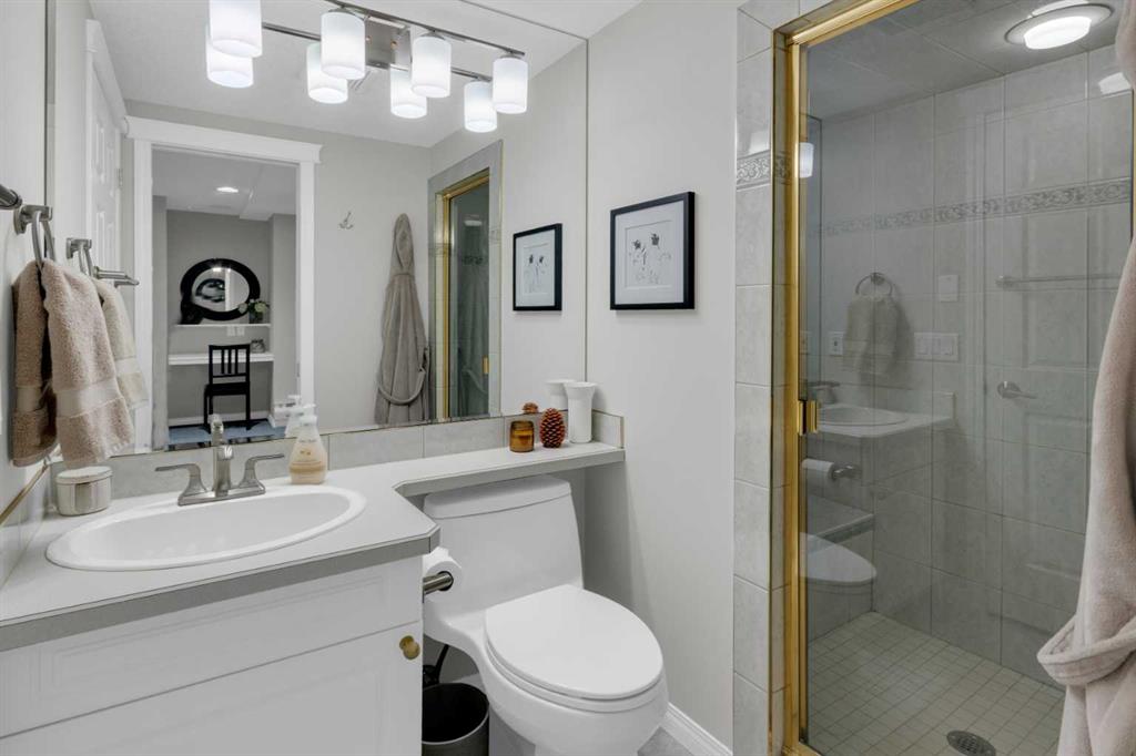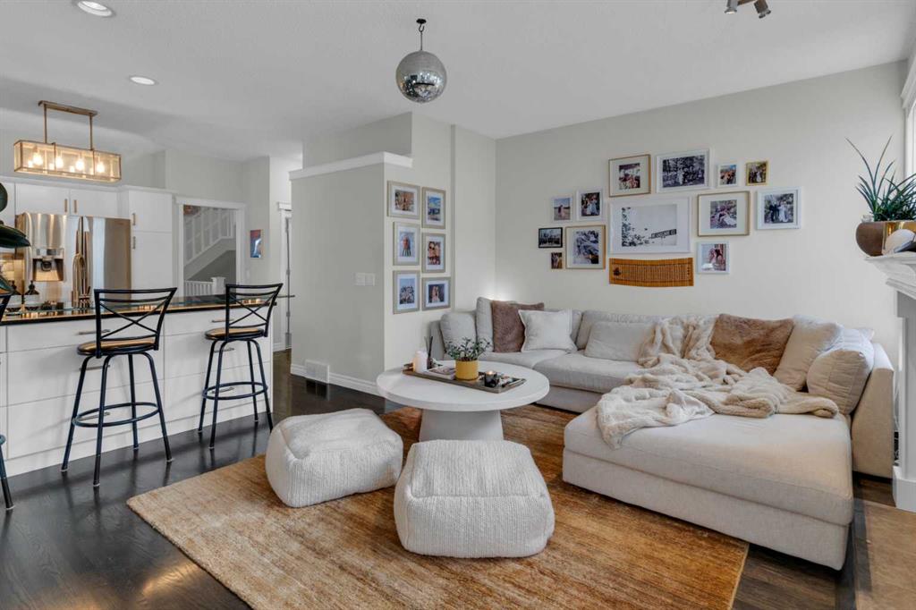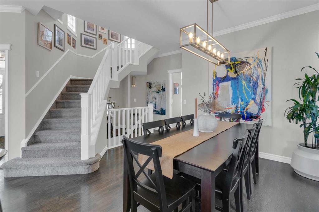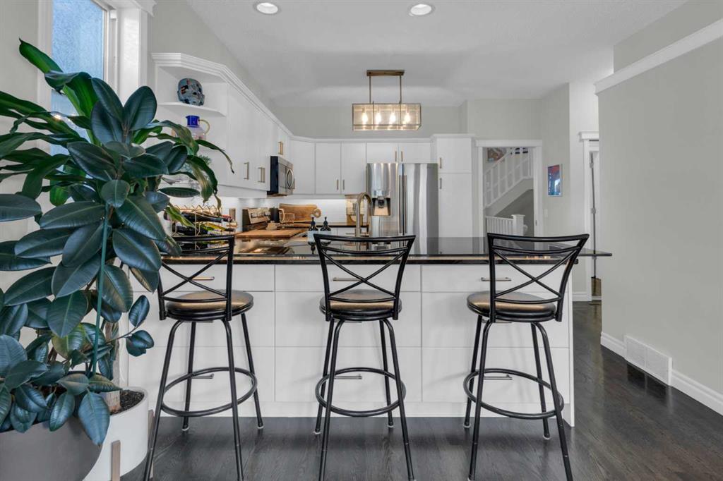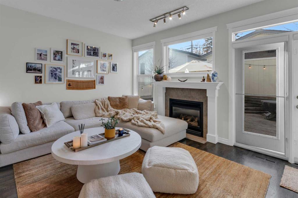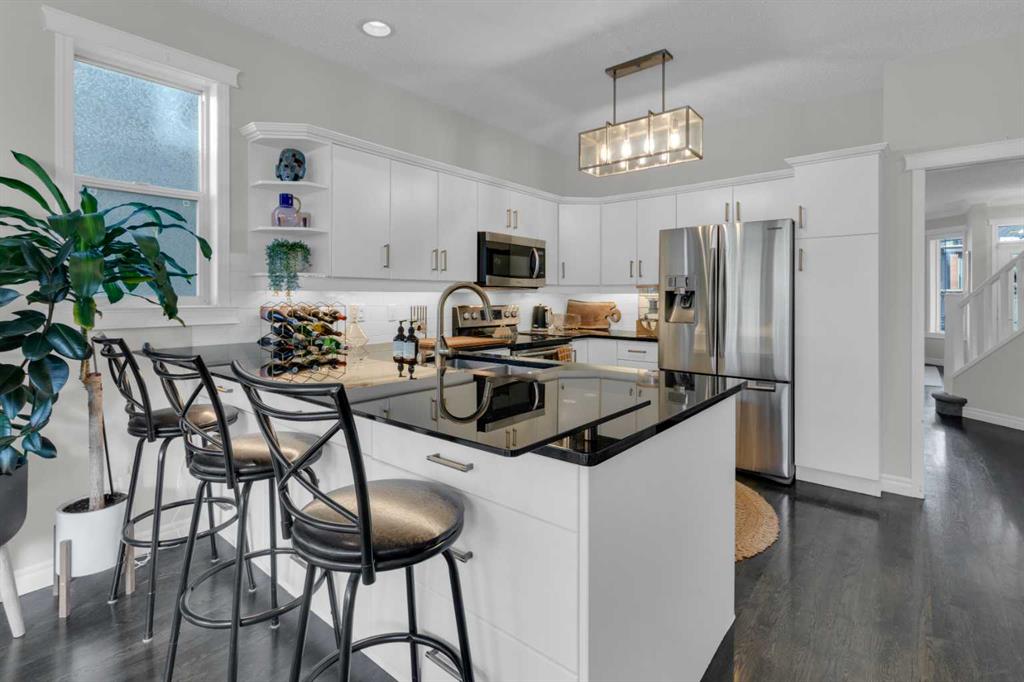 Walking up to the house you'll find a durable composite inviting porch where you can sip your morning coffee, or see the view of downtown in the distance and watch the Calgary Stampede, Canada Day and New Year's Eve annual fireworks at night. This unique inner core home is just a 10 minute drive from downtown, a 5 minute walk from restaurants and more on 4th street, It's just a 5 minute walk two blocks up to a gorgeous ridge with pathways and Elbow river access overlooking Stanley park. Also within walking distance, is the off leash Roxboro dog park. Once stepping inside the home, you are greeted by an open-concept living and dining area featuring soaring 9 ft ceilings, elegant crown moldings, and site-finished oak hardwood floors. The timeless chef’s kitchen is a focal point, finished with premium granite countertops, stainless steel appliances and a newer Bosch dishwasher. In your kitchen you'll find a custom eating bar perfect for morning coffee or evening entertaining. Underneath the custom bar are six large drawers perfect for concealed but stylish storage. All of the hardware on the cabinets and drawers are elevating gold additions from Banbury Lane. Relax in the adjacent family room with a wall of large, bright windows anchored by a cozy fireplace for those chilly Calgary nights. Your upper level is a sanctuary. You'll ascend to the second floor on a vaulted staircase to find three well-sized bedrooms. Each bedroom has new black-out-blinds and two of these rooms also feature dramatic vaulted ceilings as in the beautiful primary bedroom, creating the feeling of airy, expansive peace. The primary ensuite is a true private retreat, with it's expansive arched window bringing the outside in, while also boasting a walk-in-closet, a dual vanity and a deep jetted tub—the perfect place to unwind.