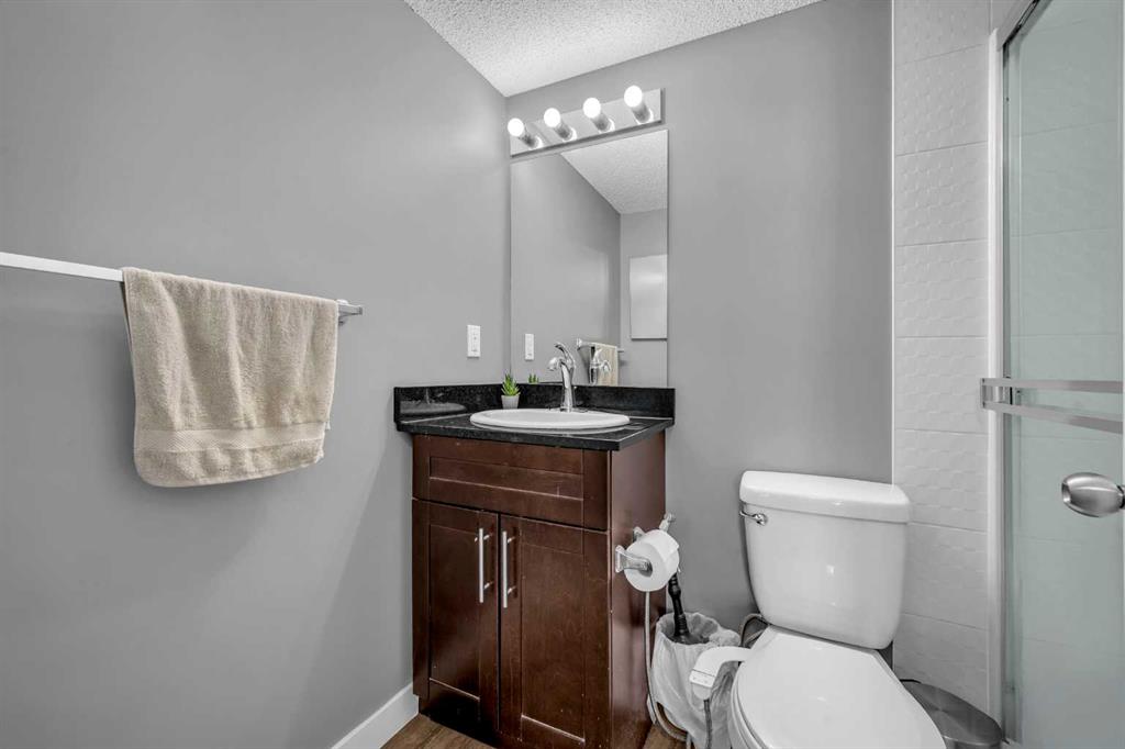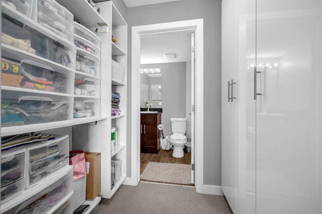 The spacious primary bedroom boasts a custom gallery-style walk-in closet and a private four-piece ensuite, while the second bedroom is conveniently located near the second full bathroom. One bathroom includes a relaxing tub, and the ensuite features a modern three-piece layout with a standing shower.