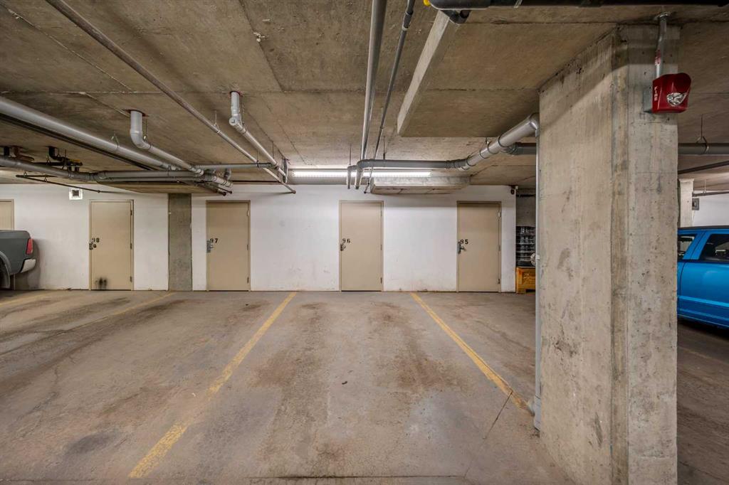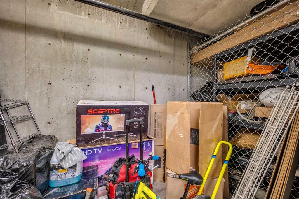 Additional highlights include in-suite laundry, a flexible den space, and a titled underground heated parking stall with a private storage room—a rare find in this complex.