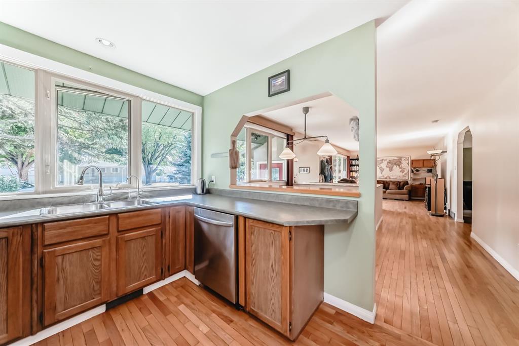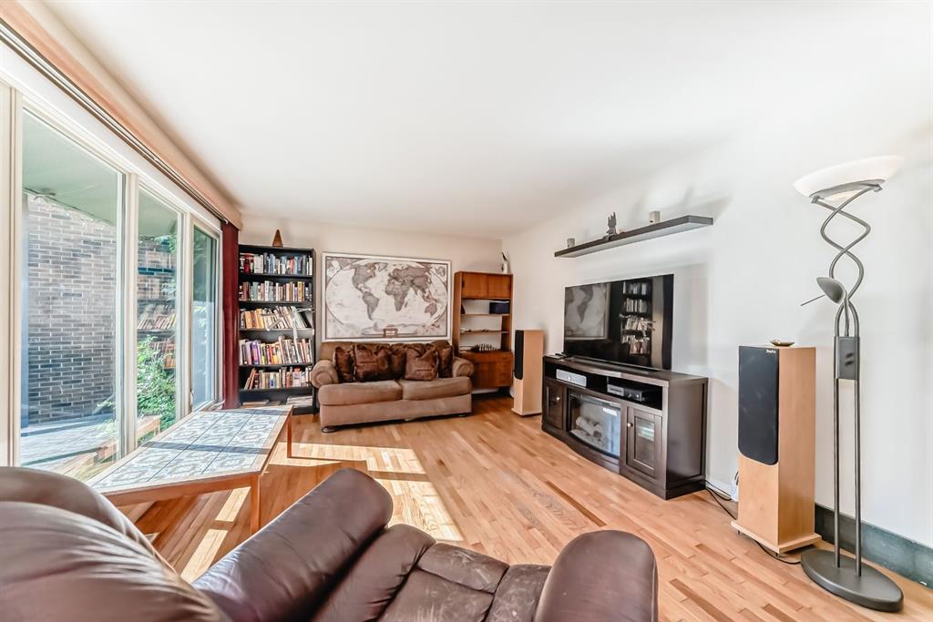 Inside, the bright, open main floor is filled with natural light from a wall of southeast-facing windows. The kitchen features a brand-new stainless steel appliance package, an eat-up breakfast bar, and flows seamlessly into the dining and living areas — perfect for family living and entertaining. One bedroom is currently set up as a den, with built-in cabinetry and French doors leading to a custom deck overlooking the backyard. Two spacious bedrooms and a full bathroom complete this level.