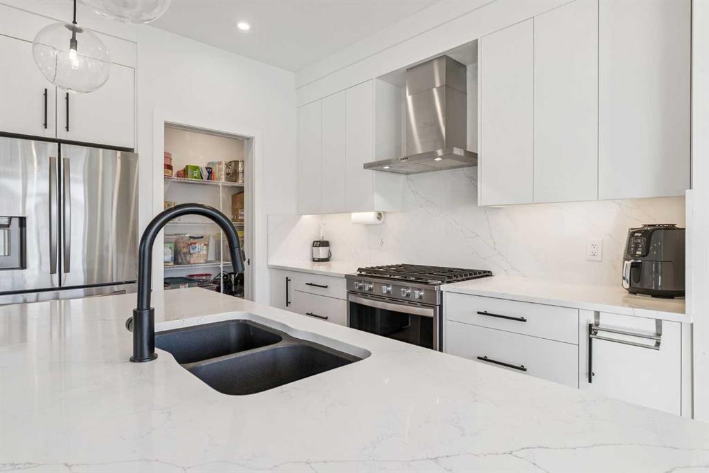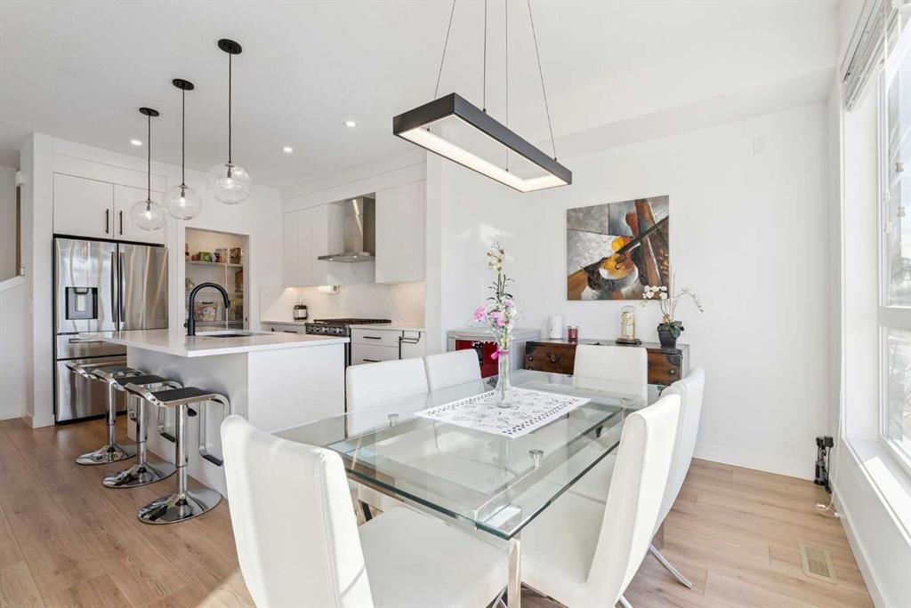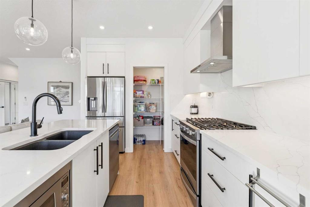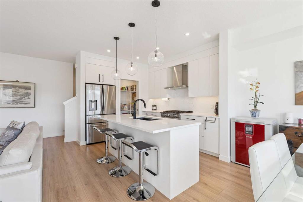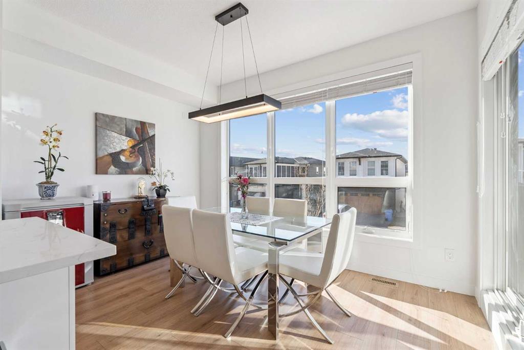 Experience elevated living in ARCOLA by Truman, a contemporary townhome community. It’s not just a townhouse, but it is more likely a luxury downsizing home where you can enjoy lifestyle with convenience and style. This END-UNIT home is perfectly positioned in a quiet neighbor providing more privacy and bit more space. It offers 2 balconies, 1 patio, over 2,400 sqft of living space including fully developed WALK-OUT basement, featuring 4 bedrooms (3+1) and 3.5 bathrooms. From the moment you step inside and greeted by gorgeous tiled foyer and 9ft ceiling, you’ll be wowed and appreciate the designer’s touch and bright, open-concept layout. Luxury vinyl prank flooring throughout in all three levels, and no more ugly carpet in this home. 9ft ceilings in main level and the basement. The spacious living area is filled with natural light and provides ample space for relaxing and entertaining. The kitchen is showcasing premium quartz countertop, stainless steel appliances, including T-shaped chimney and gas stove, generous cabinetry, spacious corner pantry, and a large central island with seating, plus there are dedicated dining area and convenient powder room to complete the main floor. Off to the balcony for alfresco lunch or evening wines or sunbathing. Upstairs, retreat to a spacious primary suite featuring a walk-in closet and a spa-inspired 5-piece ensuite with dual sinks and a deep soaker tub on gorgeous tiled floor. Step out to a dedicated balcony from your bedroom to enjoy a cup of coffee and mountain view. Two additional well-sized bedrooms, each with its own walk-in closet, and there is a full bathroom and upper-level laundry room. The fully developed WALK-OUT basement expands your living space with a cozy family room ideal for movie nights or home office or gym, a fourth bedroom, and an additional full bathroom make a perfect living space for over night guests and teen ager children or rent it out for additional income. The heated double garage can fit two cars and still providing additional storage space for all your seasonal gears. Additional upgrades are garburator, ceiling fan and air conditioner for comfortable living. The layout of this townhouse was one of the top seller and is not coming to the market very often. Not to mention just minutes from top-rated schools, Westside Rec Centre, parks, playgrounds, shops, restaurants, cafes, major roads, and public transit to have ultimate balance of lifestyle and accessibility. Don't miss this golden opportunity. Book your showing today!