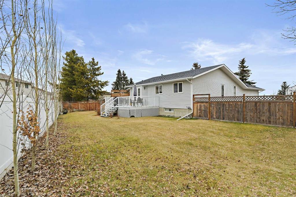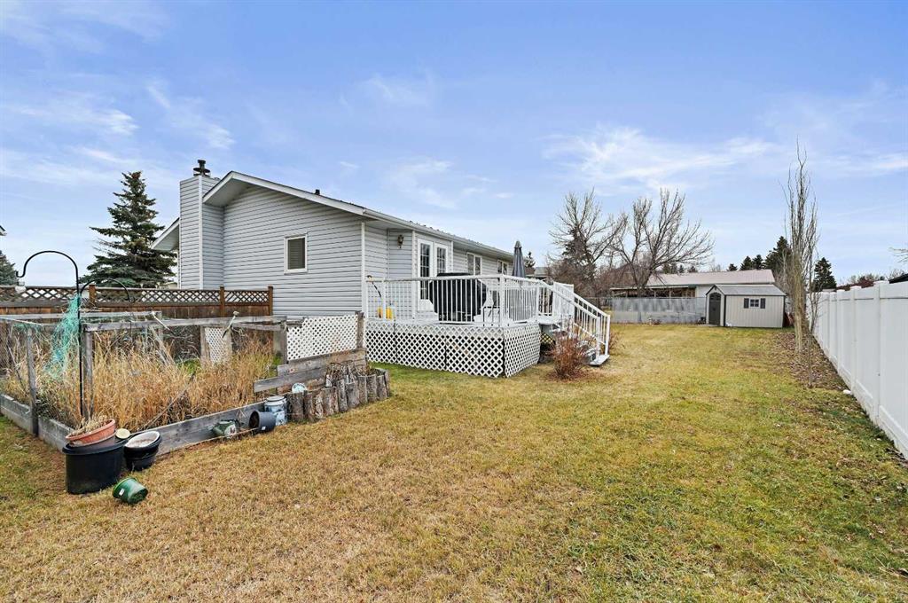 What a great opportunity in the charming & peaceful community of Irricana! This lovely 4-bed 3-bath bungalow is nicely situated along a quiet street on a large oversized lot with a west facing backyard. The convenient side drive-thru access provides abundant parking, boat & RV storage and/or the ability to add an additional garage / shop in the massive back yard. Inside you’ll find a spacious front entry leading to a bright living space warmed by the majestic highly sought after wood burning fireplace. Beyond that is the large eat in kitchen, loaded with counter space and cabinet storage allowing plenty of freedom for the chef. The wall between the two rooms has been opened creating a shared space adding to the charm of the main floor. Off the kitchen is the double door to the back deck where you can catch a gorgeous sunset or just bathe in the evening sun. The large yard hosts a garden, a shed, a large green space, mature rose bushes and large aspens that fill to provide great summer shade and privacy. Back inside is a large master bedroom equipped with a rare 3-piece ensuite and large closet. Two additional generous sized rooms with large closets share a well-appointed 4-piece bath to complete the main floor. Excitement continues as we head to the partially developed basement with a large open rec space, another bedroom, laundry room and mechanical room hosting a fully functional bathroom with lots of storage. This home also includes the convenience of an oversized attached double garage with electric heating. Embrace small-town charm while enjoying incredible accessibility – a short 30 min drive to Calgary, 25 to Airdrie offering every amenity imaginable, including Costco & Cross Iron Mills. This bungalow isn't just a home; it's your peaceful retreat with urban convenience offering the perfect blend of space, functionality, and potential— ready for its next owners to make it their own.