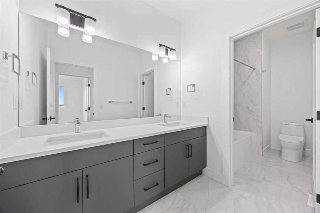 **For a limited time the builder is offering $20,000 in buyer upgrades throughout home (excluding appliances)** Welcome to the brand new development of Knightsbridge in Cambridge Park. Minutes away from access to Stoney Trail and East Hills shopping centre. The EDEN is a stunning estate home designed to blend luxury and practicality. Set on a generous 6027 sq ft lot, this home provides an expansive backyard and a side-drive triple car garage. These are not your typical cookie cutter homes. With 3,502 sq ft of living space, this custom-built masterpiece features 5 spacious bedrooms and 4.5 beautifully designed bathrooms, offering ample room for family and guests. This home is loaded with upgrades including: Main floor full ensuite bath as well as an added powder room, Jack and Jill ensuites for added convenience, High ceilings & a Spice kitchen to enhance your culinary experiences. Inside, the main floor exudes elegance with rich hardwood flooring and 9 ft ceilings with 8 ft doors, and striking black-framed windows that invite natural light. The gourmet kitchen is a chef’s dream, complete with an oversized island, a secondary spice kitchen, sleek stainless steel appliances. An open concept formal dining and living area set the stage for gatherings. The main floor also includes a flex room as well as a 4 pc ensuite bathroom. The primary suite on the upper floors is a true sanctuary with a freestanding tub and a custom-built closet. The home’s thoughtful design continues with 3 more generous sized bedrooms on the second floor, a bonus room for entertaining, a Jack & Jill ensuite bathroom for convenience, as well as a second floor laundry room. . Step outside to enjoy a completed rear deck with steps leading to a private outdoor oasis. This home also offers a triple attached garage allowing plenty of space for extra parking. This community is within minutes to Calgary, Chestermere, and East Hills, 18 minutes to Downtown Calgary, and provides quick access to Stoney Trail, Highway 1, and McKnight Blvd making it easy to get anywhere in and around the city. Located near shopping centres, public and private schools, Khalsa school's, parks, and many other amenities, while still offering quiet country-living with wide open green spaces, walking paths, and playgrounds.